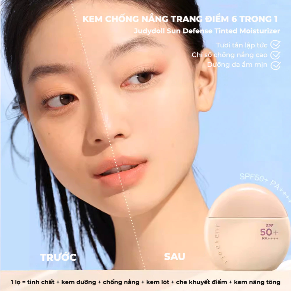 Kem Dưỡng Chống Nắng Judydoll Sun Defense Tinted Moisturizer SPF50+ PA++++ không chỉ đơn thuần là sản phẩm chống nắng. Nó còn kết hợp tinh chất dưỡng da, kem lót, che khuyết điểm và nâng tông. Điều này giúp che phủ hiệu quả các vết đỏ và xỉn màu, đồng thời giúp da đều màu và trong mờ.