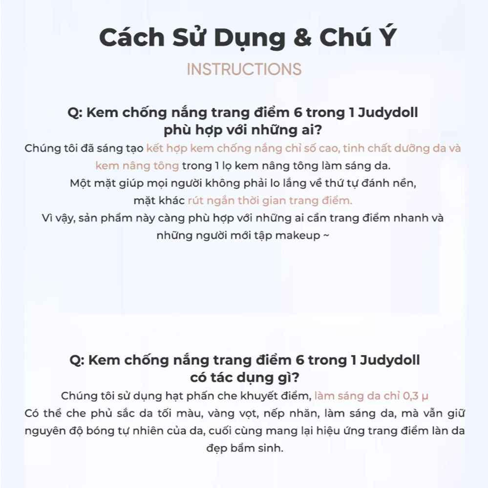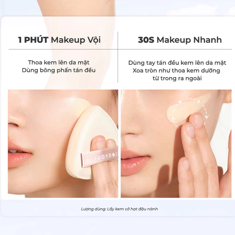 Công thức đột phá với SPF50+ PA++++ chặn đứng 98% tia UV gây hại, kết hợp hyaluronic acid giữ ẩm sâu và vitamin E chống oxy hóa, Judydoll không chỉ bảo vệ da mà còn nuôi dưỡng từ bên trong. Kết cấu mỏng nhẹ như sữa, thẩm thấu nhanh không nhờn rít, mang lại lớp nền skin-like tự nhiên với độ che phủ trung bình – đủ mờ lỗ chân lông to, vết thâm mụn hay quầng mắt mà không hề cakey. Hiệu ứng tone up nhẹ nhàng làm đều màu da, giúp bạn tự tin mà không cần thêm lớp makeup dày.