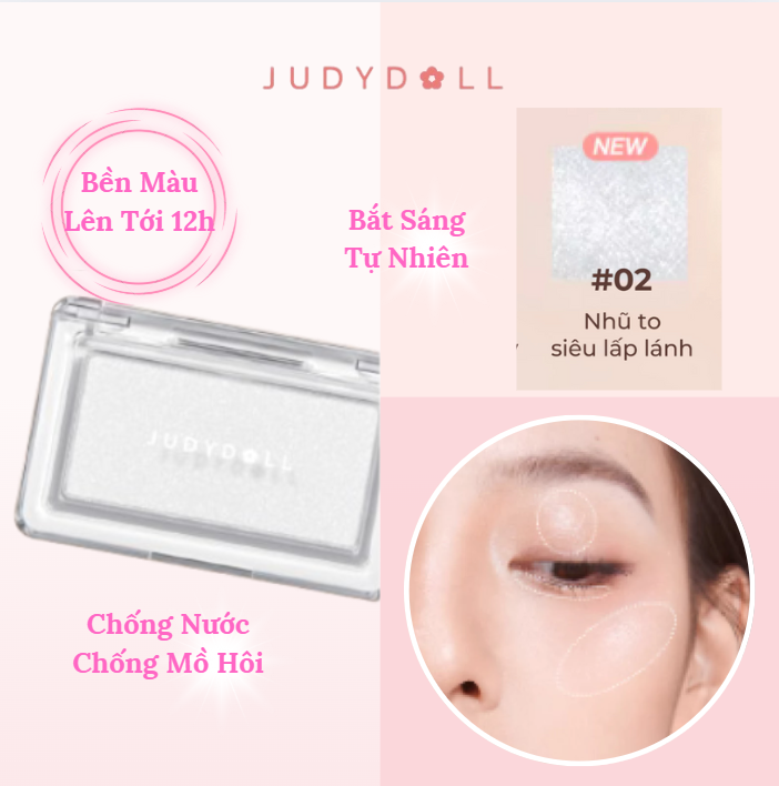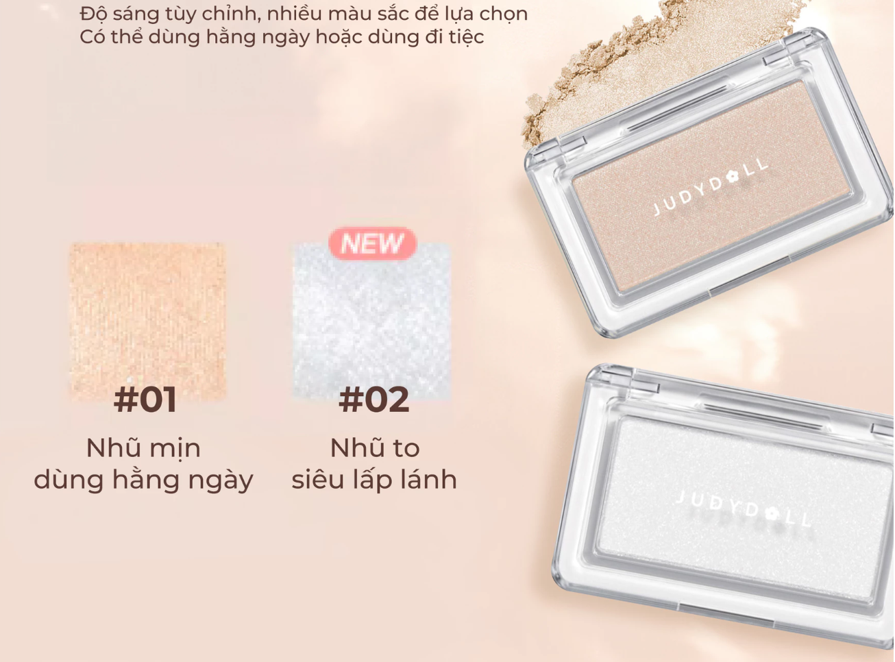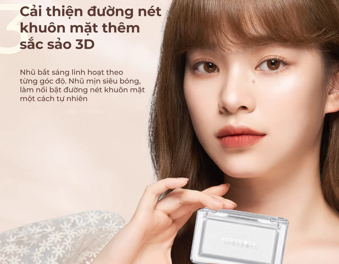 Không chỉ dừng lại ở hiệu ứng bắt sáng, phấn Judydoll còn chứa các thành phần dưỡng da nhẹ nhàng như vitamin E, giúp da mềm mịn và khỏe mạnh hơn sau mỗi lần sử dụng. Sản phẩm phù hợp với mọi tone da Á Đông, từ da trắng sáng đến da ngăm, và có thể dùng riêng lẻ hoặc kết hợp với kem nền, phấn má để tạo lớp makeup hài hòa. Bao bì thiết kế tối giản, màu sắc nhũ pastels xinh xắn, mang phong cách trẻ trung, hiện đại – đúng tinh thần của Judydoll.